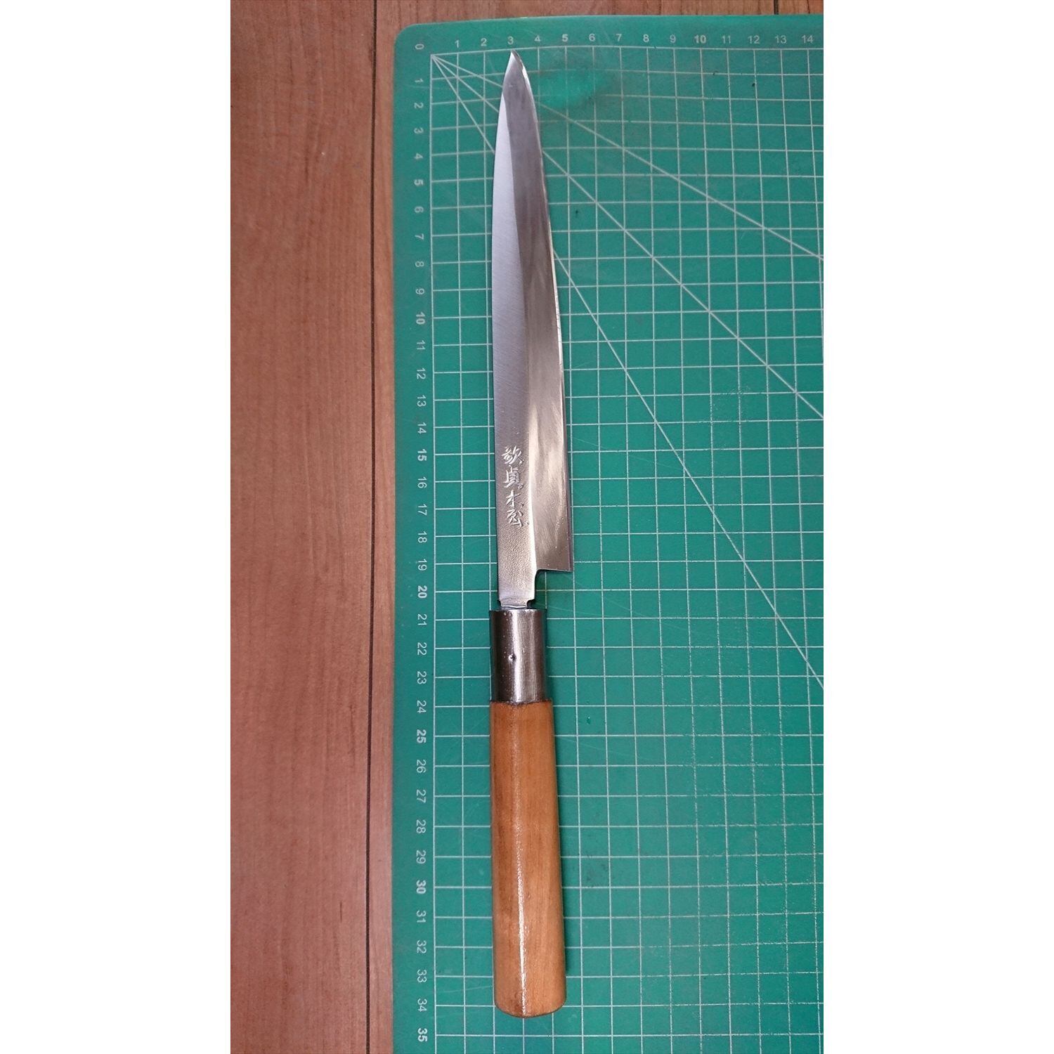 1. o3722/状態:中古/銘:歌貞木屋/刺身包丁(片刃 右利き用)/刃長:195/峰厚 アゴ上:3.0/重量:107/作り:鋼/他:ツバの根元から柄全体にかけて樹脂コーティング済み(防汚防サビの為)