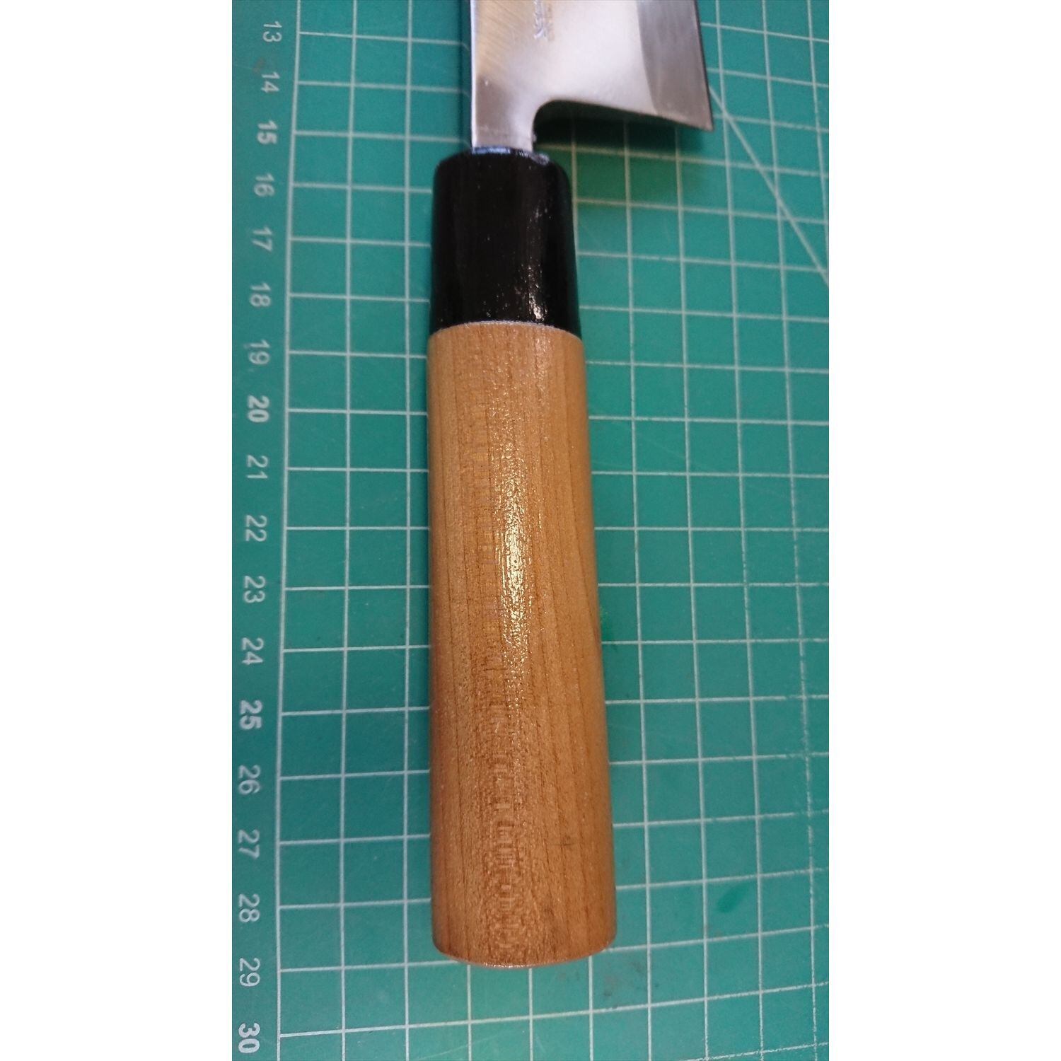 1. o3725/状態:中古/銘:堺刀司/出刃包丁(片刃 右利き用)/刃長:150/峰厚 アゴ上:8.2/重量:233/作り:鋼/他:ツバの根元から柄全体にかけて樹脂コーティング済み(防汚防サビの為)