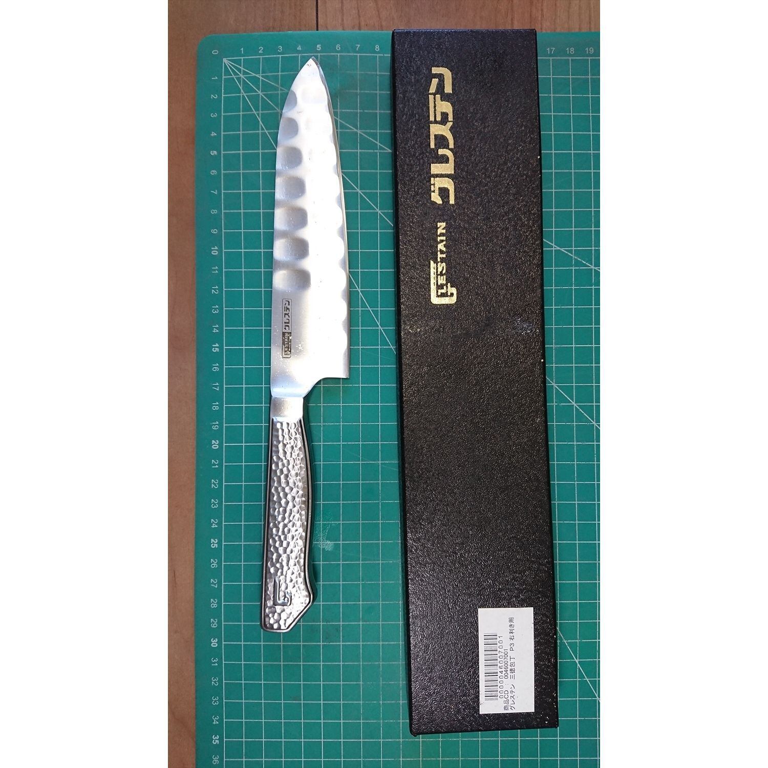 1. o3776/状態:中古/銘:グレステン/三徳包丁(両刃 約 左1:右9 右利き用)/刃長:170/峰厚 アゴ上:2.4/重量:162/作り:グレステン鋼/他:箱(汚れ破れあり)、グレステン製六角シャープナー付き