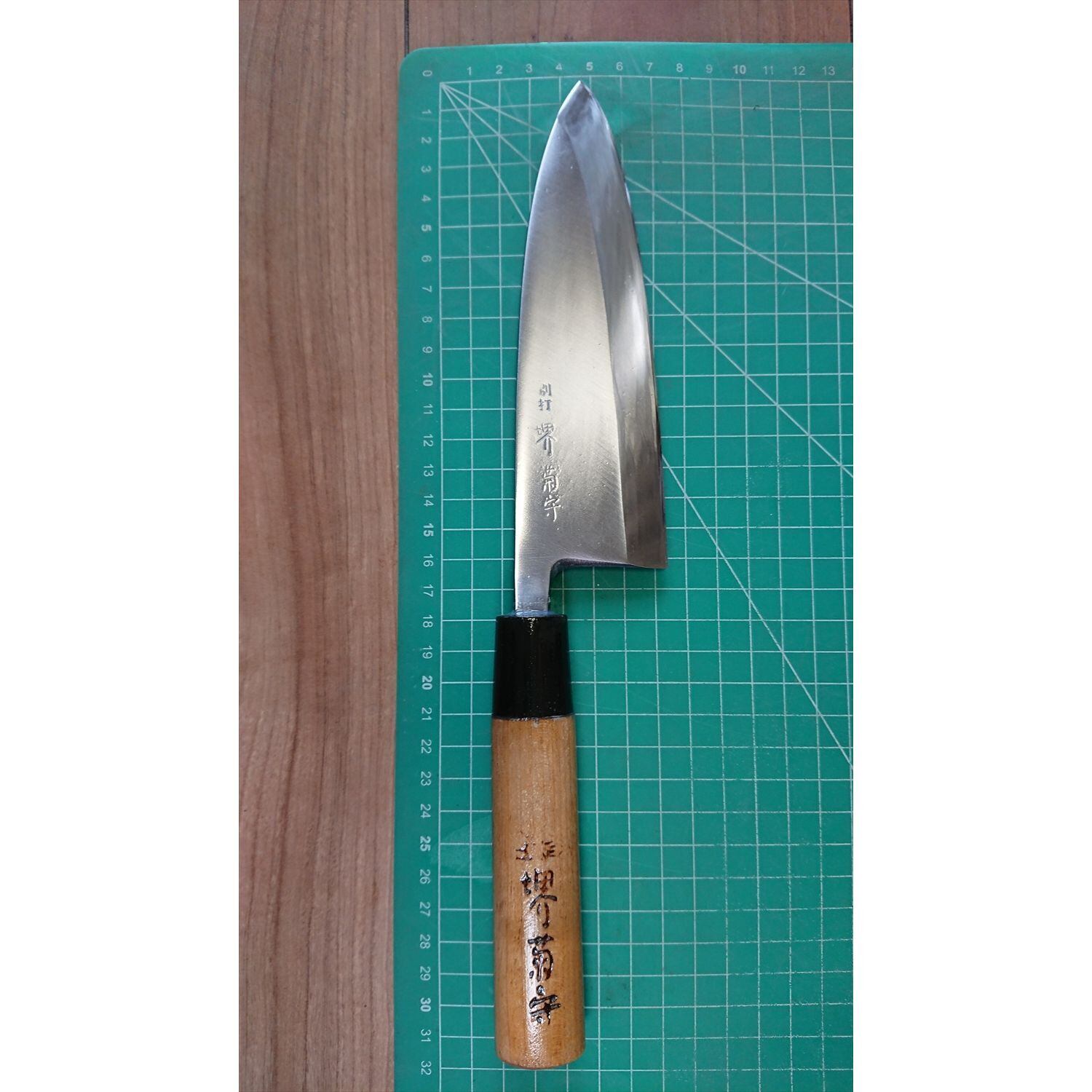 1. o3758/状態:中古/銘:堺菊守/出刃包丁(片刃 右利き用)/刃長:165/峰厚 アゴ上:8.7/重量:273/作り:鋼/他:ツバの根元から柄全体にかけて樹脂コーティング済み(防汚防サビの為)