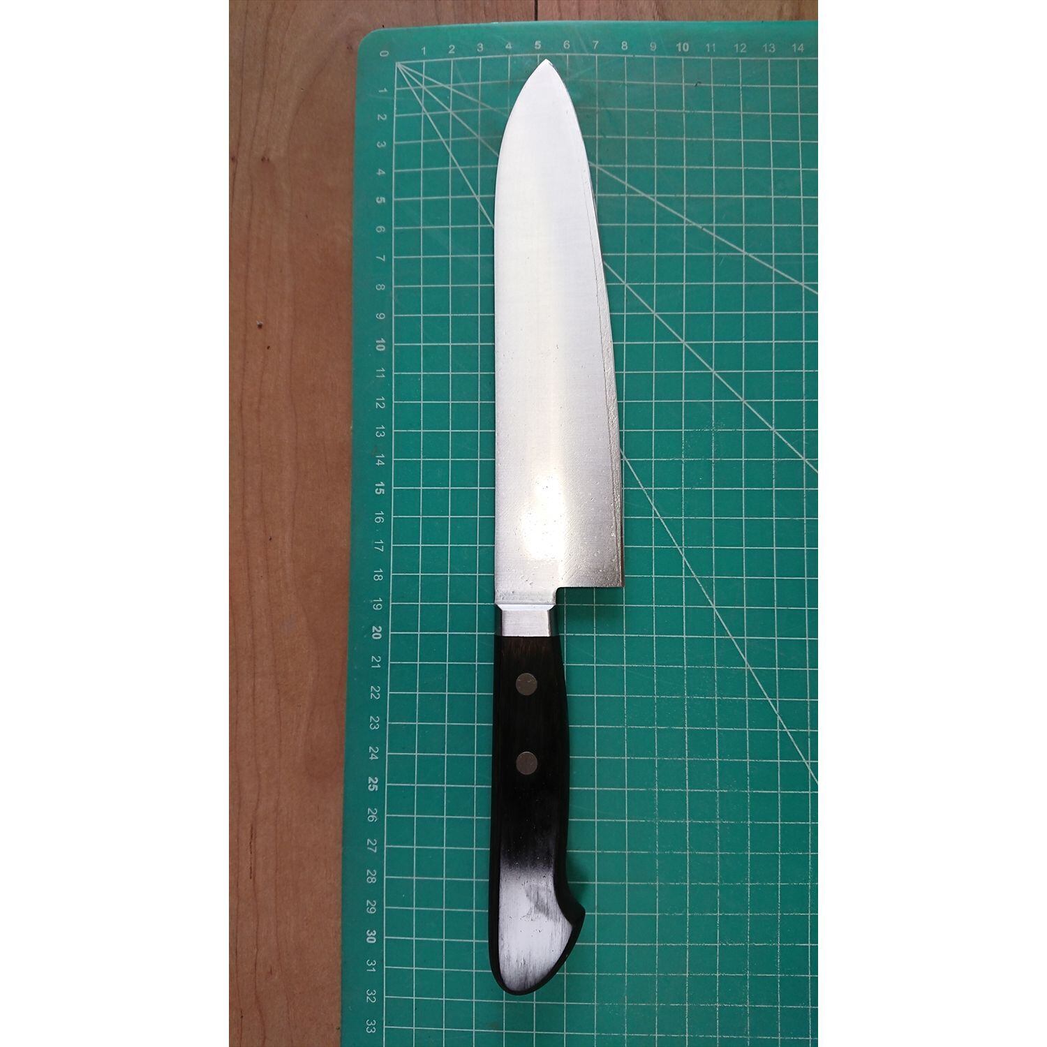 1. o3803/状態:中古/銘:堺屋真/牛刀(両刃 左5:右5 右利き・左利き兼用)/刃長:180/峰厚 アゴ上:1.8/重量:145/作り:本割込鋼(鋼をステンレスでサンド)/他: