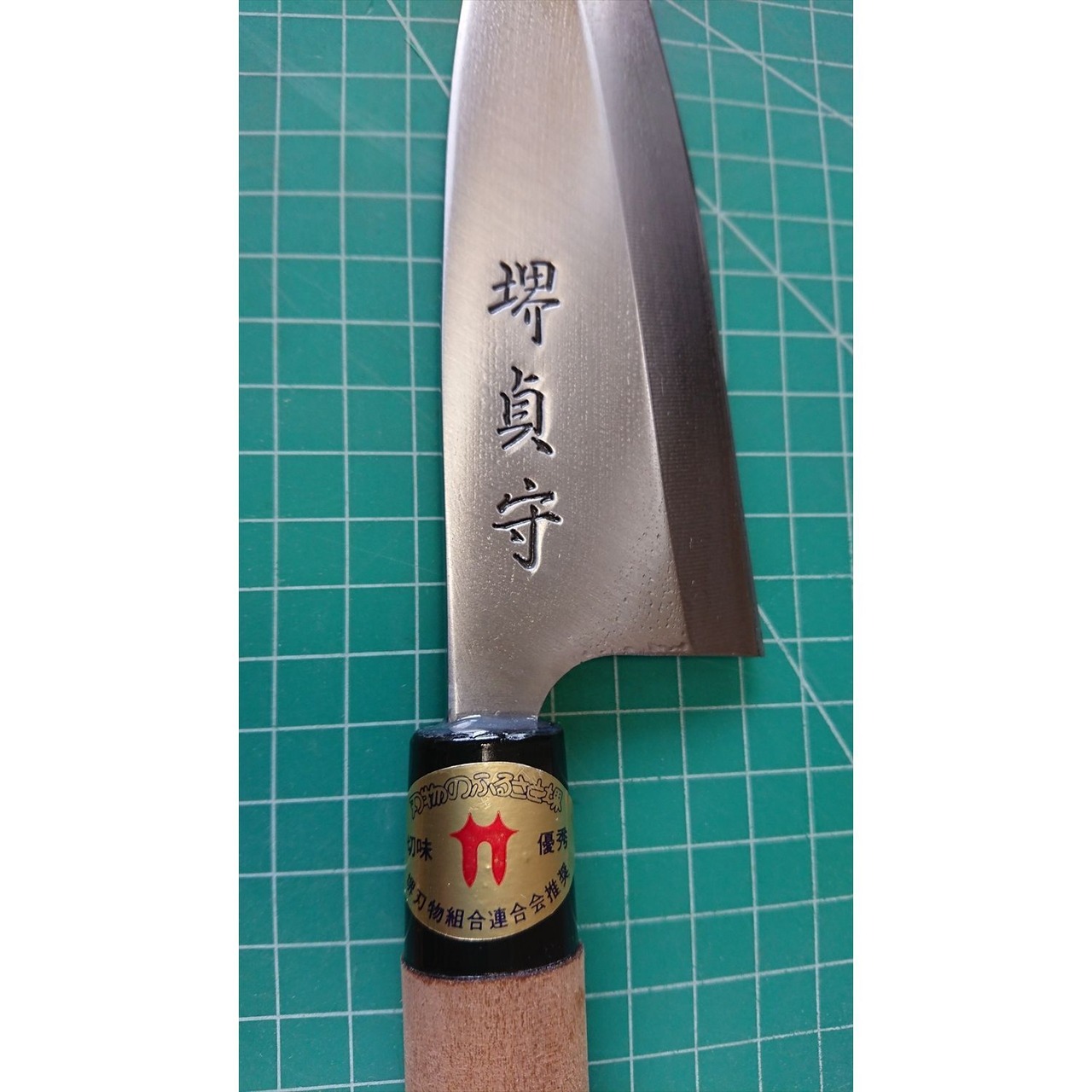 1. o3801/状態:中古/銘:堺貞守/相出刃包丁(片刃 右利き用)/刃長:150/峰厚 アゴ上:4.1/重量:186/作り:鋼/他: