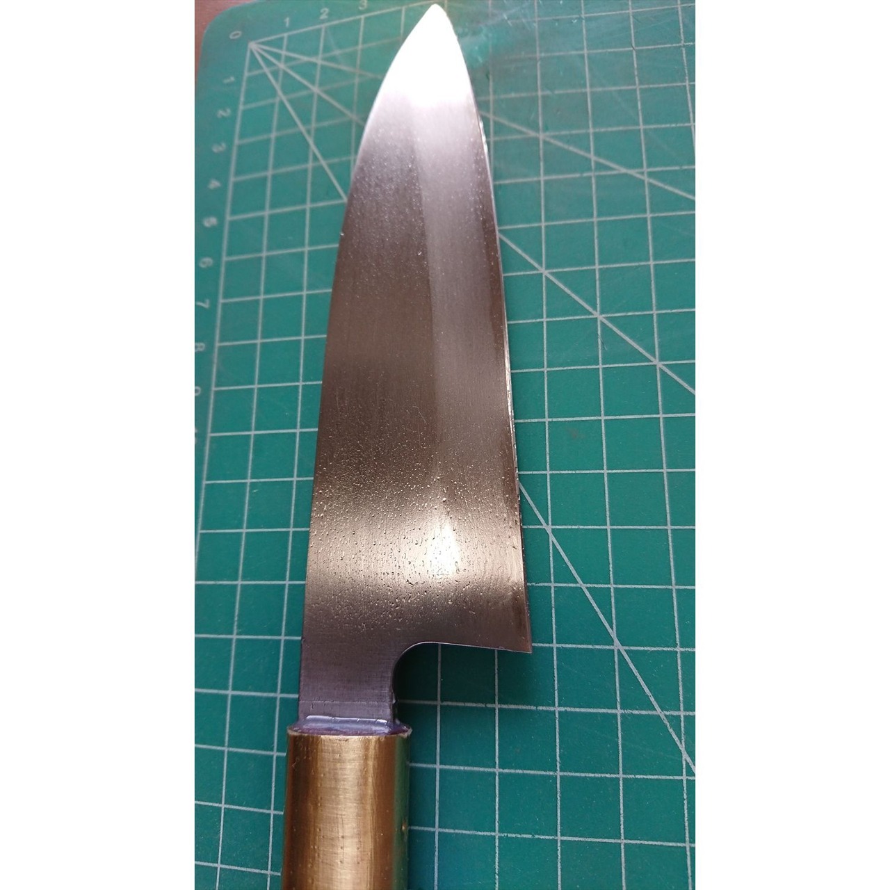 1. o3811/状態:中古/銘:銘?/相出刃包丁(両刃 約 左1:右9 右利き用)/刃長:140/峰厚 アゴ上:4.3/重量:123/作り:鋼/他:ツバの根元から柄全体にかけて樹脂コーティング済み(3回塗り。防汚防サビの為)