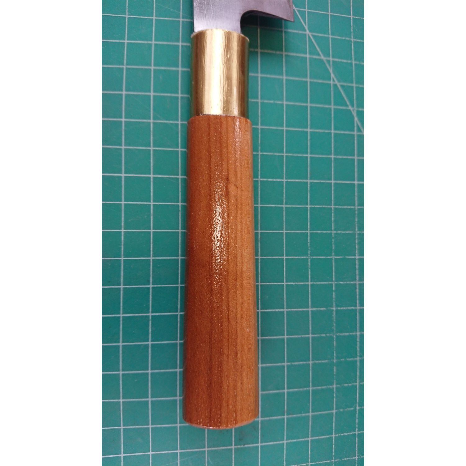 1. o3817/状態:中古/銘:銘?/相出刃包丁(両刃 約 左1:右9 右利き用)/刃長:140/峰厚 アゴ上:4.3/重量:123/作り:鋼/他:ツバの根元から柄全体にかけて樹脂コーティング済み(3回塗り。防汚防サビの為)