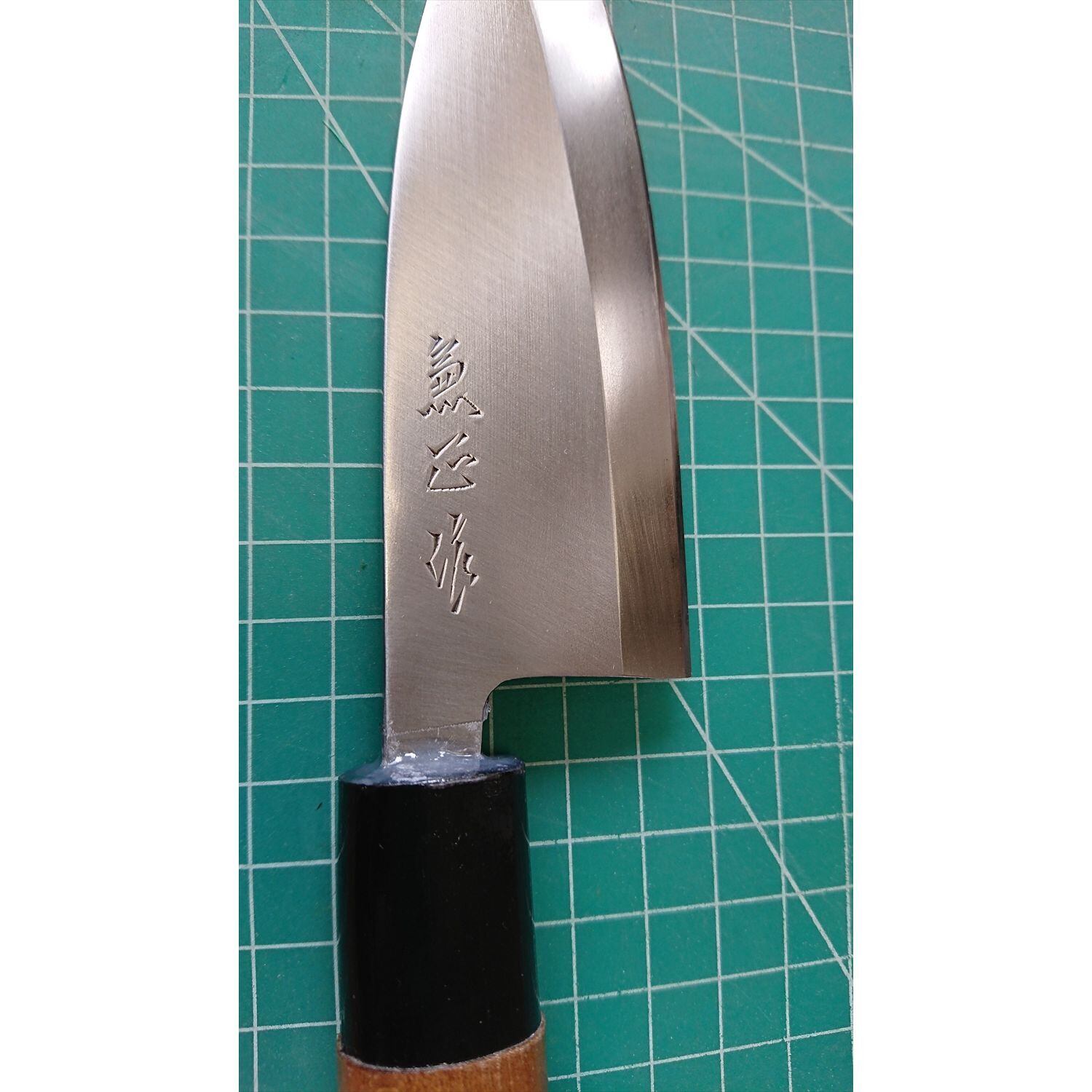 1. o3823/状態:中古/銘:魚正作/小出刃包丁(片刃 右利き用)/刃長:130/峰厚 アゴ上:7.1/重量:166/作り:鋼 手づくり/他:ツバの根元から柄全体にかけて樹脂コーティング済み(3回塗り。防汚防サビの為)