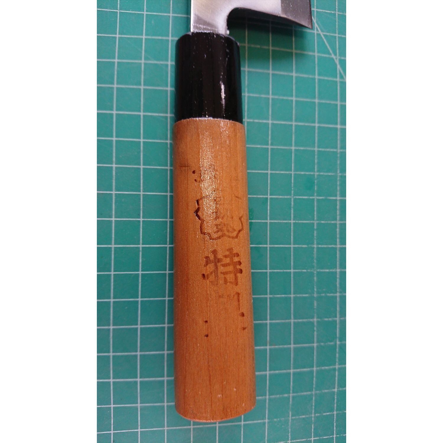 1. o3802/状態:中古/銘:四郎丸/出刃包丁(片刃 右利き用)/刃長:165/峰厚 アゴ上:9.2/重量:292/作り:鋼 手打/他:ツバの根元から柄全体にかけて樹脂コーティング済み(3回塗り。防汚防サビの為)