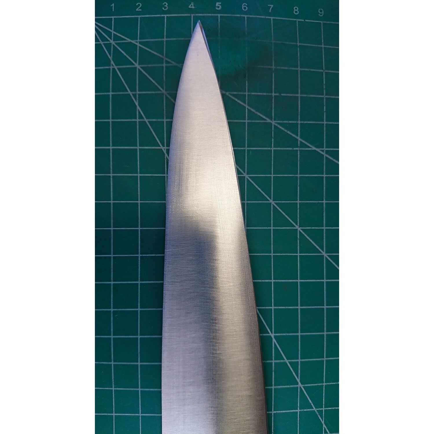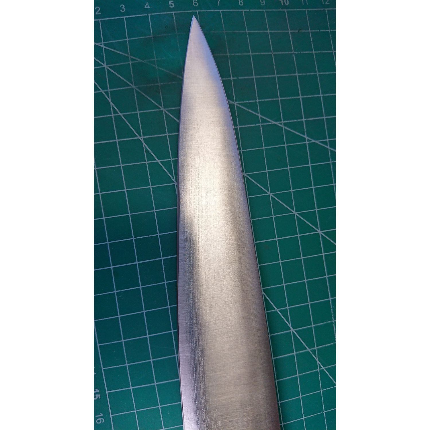 1. o3834/状態:中古/銘:長義/牛刀(両刃 左5:右5 右利き・左利き兼用)/刃長:240/峰厚 アゴ上:2.3/重量:135/作り:鋼/他:ツバの根元から柄全体にかけて樹脂コーティング済み(3回塗り。防汚防サビの為)