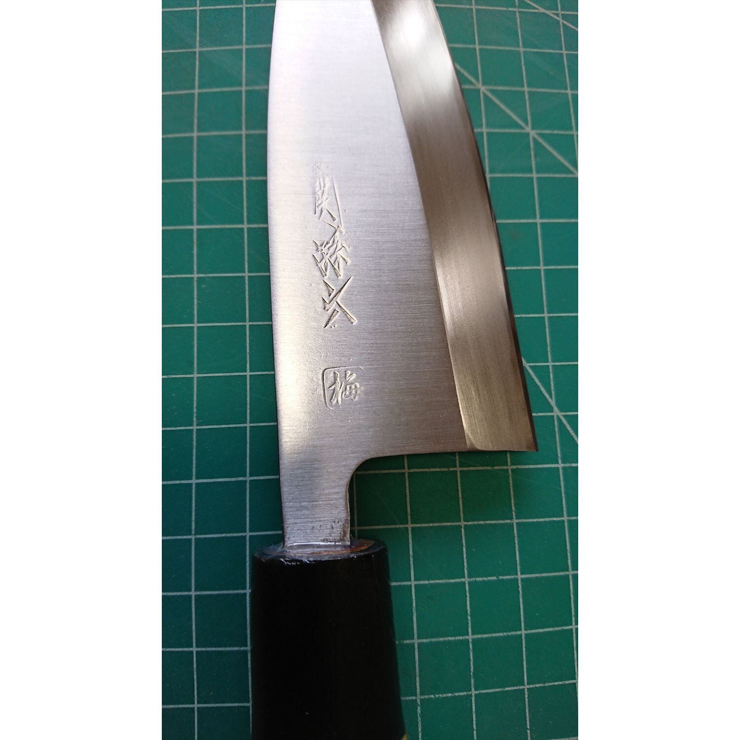 1. o3873/状態:中古/銘:関孫六 梅/出刃包丁(片刃 右利き用)/刃長:150/峰厚 アゴ上:7.7/重量:231/作り:鋼/他:ツバの根元から柄全体にかけて樹脂コーティング済み(3回塗り。防汚防サビの為)
