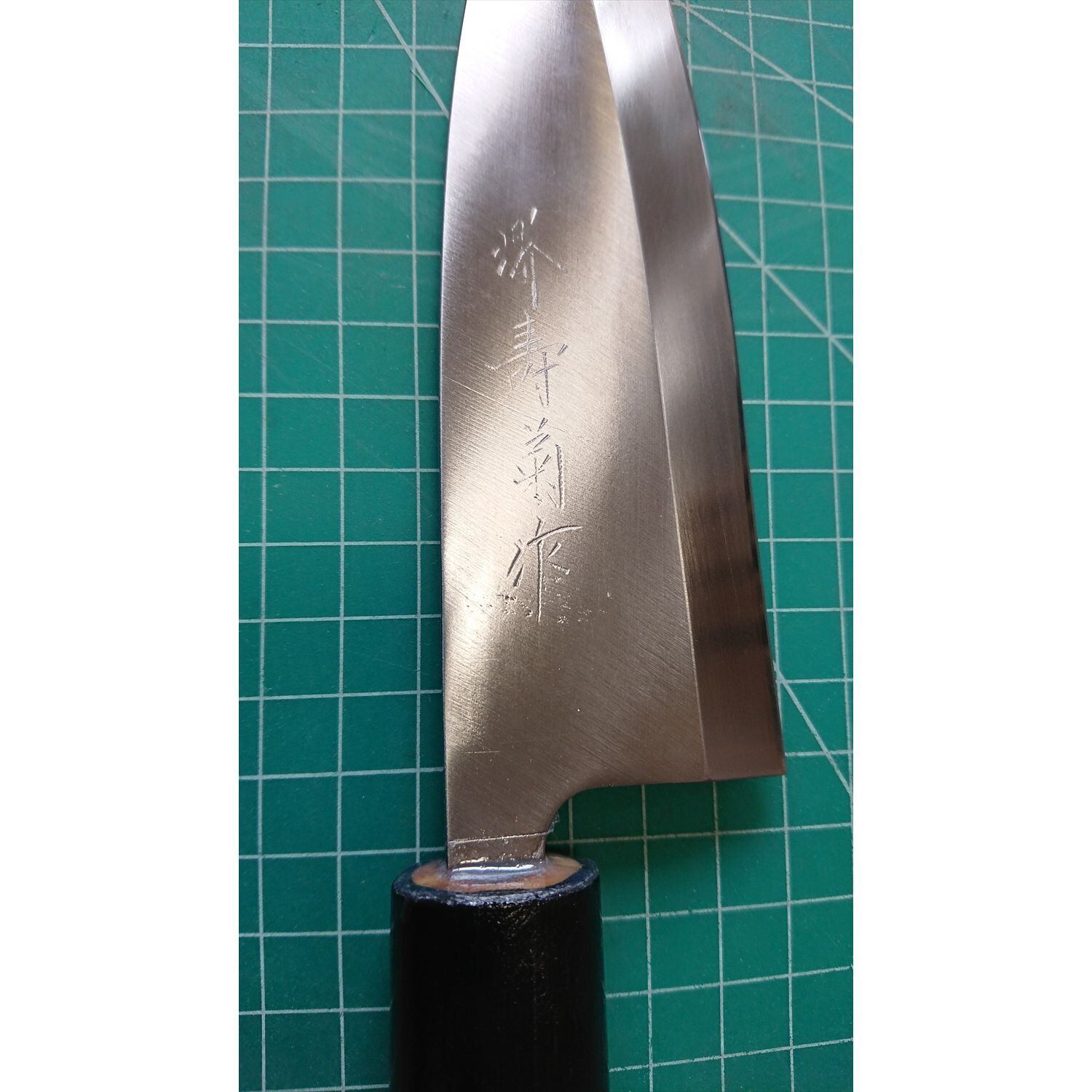 1. o3878/状態:中古/銘:堺寿菊/出刃包丁(片刃 右利き用)/刃長:150/峰厚 アゴ上:4.7/重量:204/作り:不錆鋼/他:柄は新品と交換済み。ツバの根元から柄全体にかけて樹脂コーティング済み(3回塗り。防汚防サビの為)