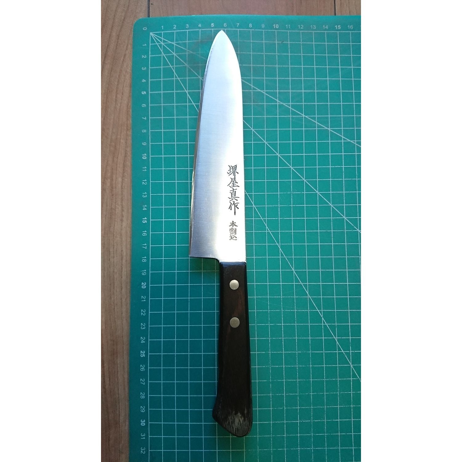 1. o3885/状態:中古/銘:堺屋真作/牛刀(両刃 左5:右5 右利き・左利き兼用)/刃長:180/峰厚 アゴ上:2.6/重量:141/作り:本割込鋼(鋼をステンレスでサンド)/他: