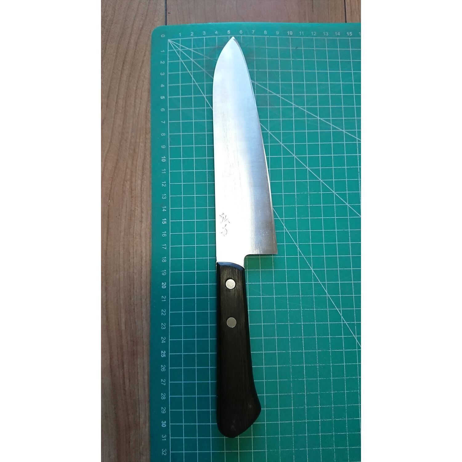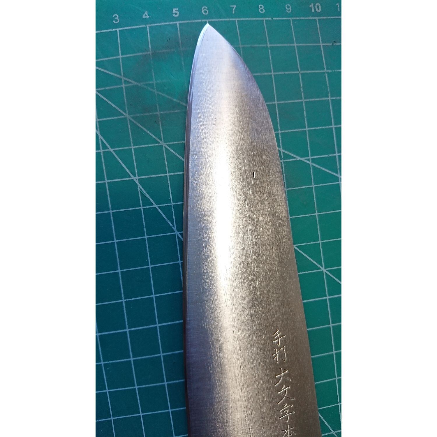 1. o3894/状態:中古/銘:大文字/牛刀(両刃 左5:右5 右利き・左利き兼用)/刃長:180/峰厚 アゴ上:1.8/重量:148/作り:手打 本割込鋼(鋼をステンレスでサンド)/他: