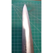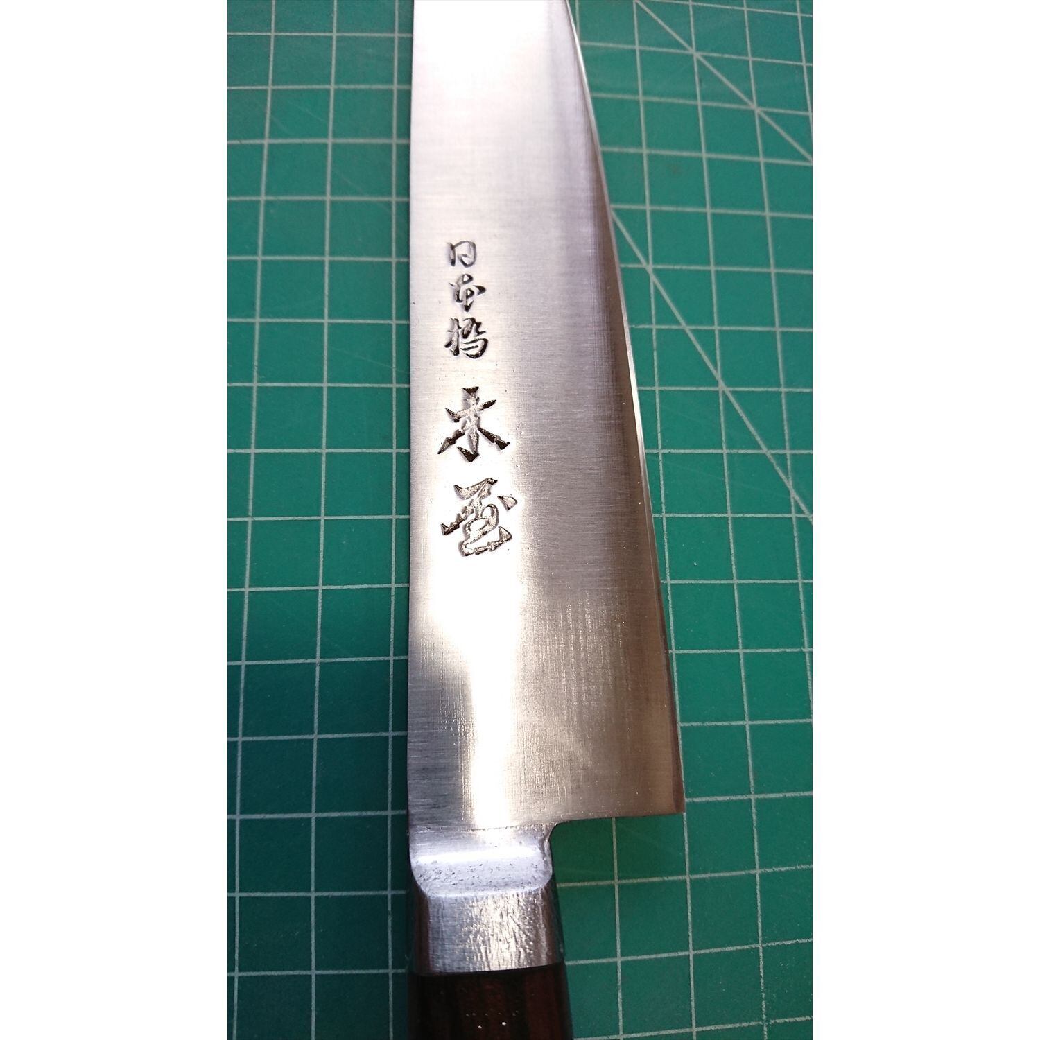 1. o3924/状態:中古/銘:日本橋木屋(MISONOブレード)/牛刀(両刃 左5:右5 右利き・左利き兼用)/刃長:200/峰厚 アゴ上:2.0/重量:111/作り:スウェーデン鋼/他:柄はオーバーホール済み。ツバの根元から柄全体にかけて樹脂コーティング済み(3回塗り。防汚防サビの為)