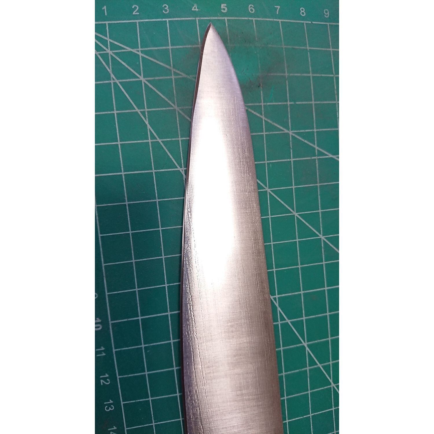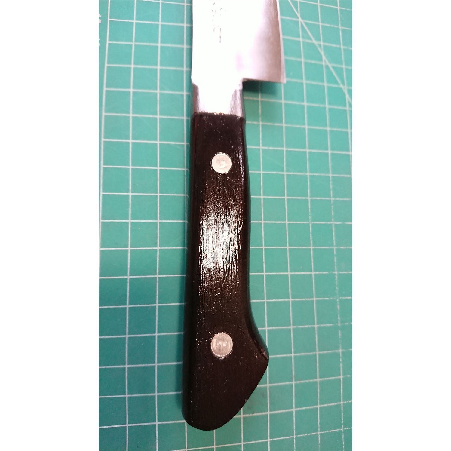 1. o3925/状態:中古/銘:江戸駒/牛刀(両刃 左5:右5 右利き・左利き兼用)/刃長:175/峰厚 アゴ上:1.5/重量:103/作り:鋼/他:柄はオーバーホール済み。ツバの根元から柄全体にかけて樹脂コーティング済み(3回塗り。防汚防サビの為)