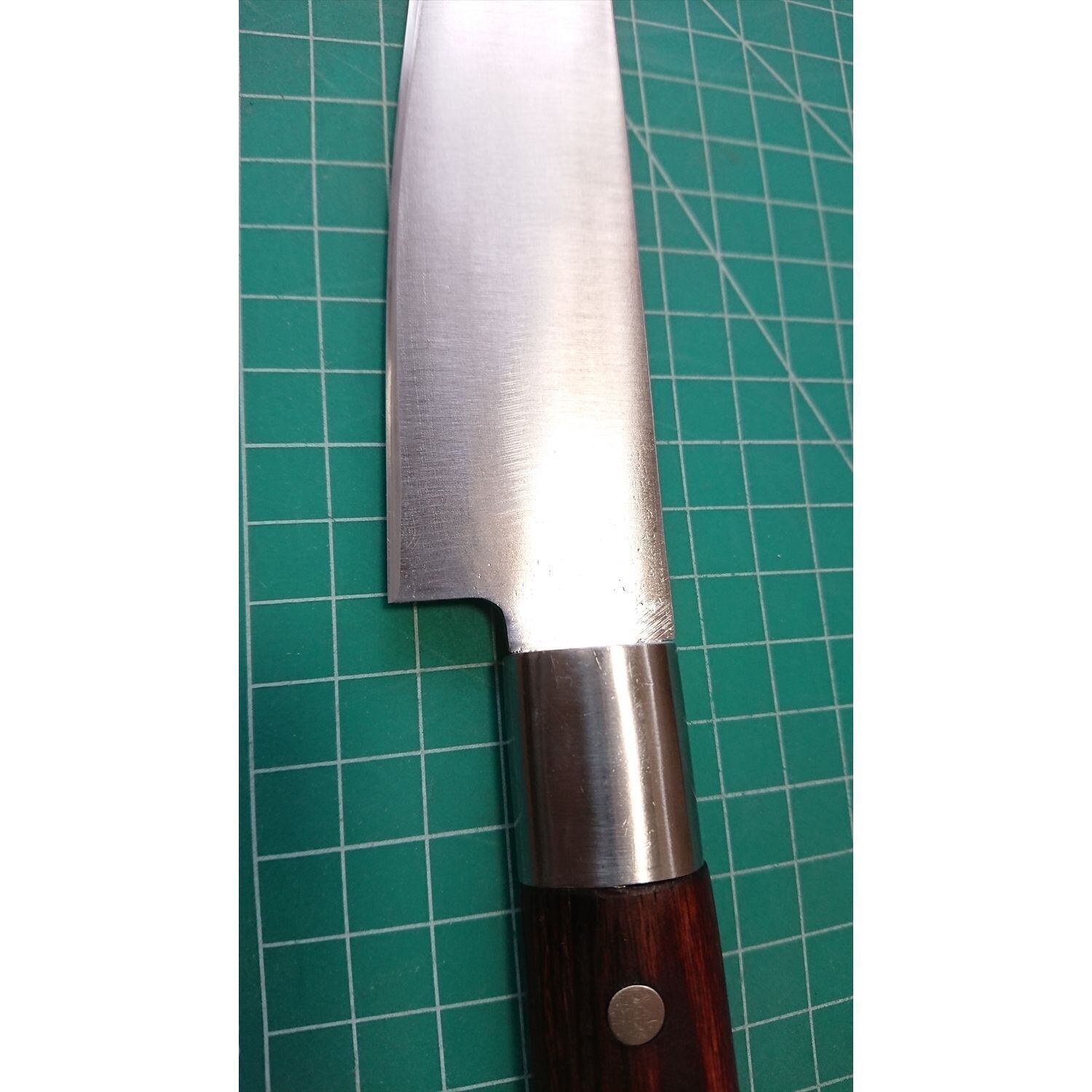 1. o3938/状態:中古/銘:和房作/牛刀(両刃 左5:右5 右利き・左利き兼用)/刃長:170/峰厚 アゴ上:1.8/重量:125/作り:割込鋼(鋼をステンレスでサンド)/他: