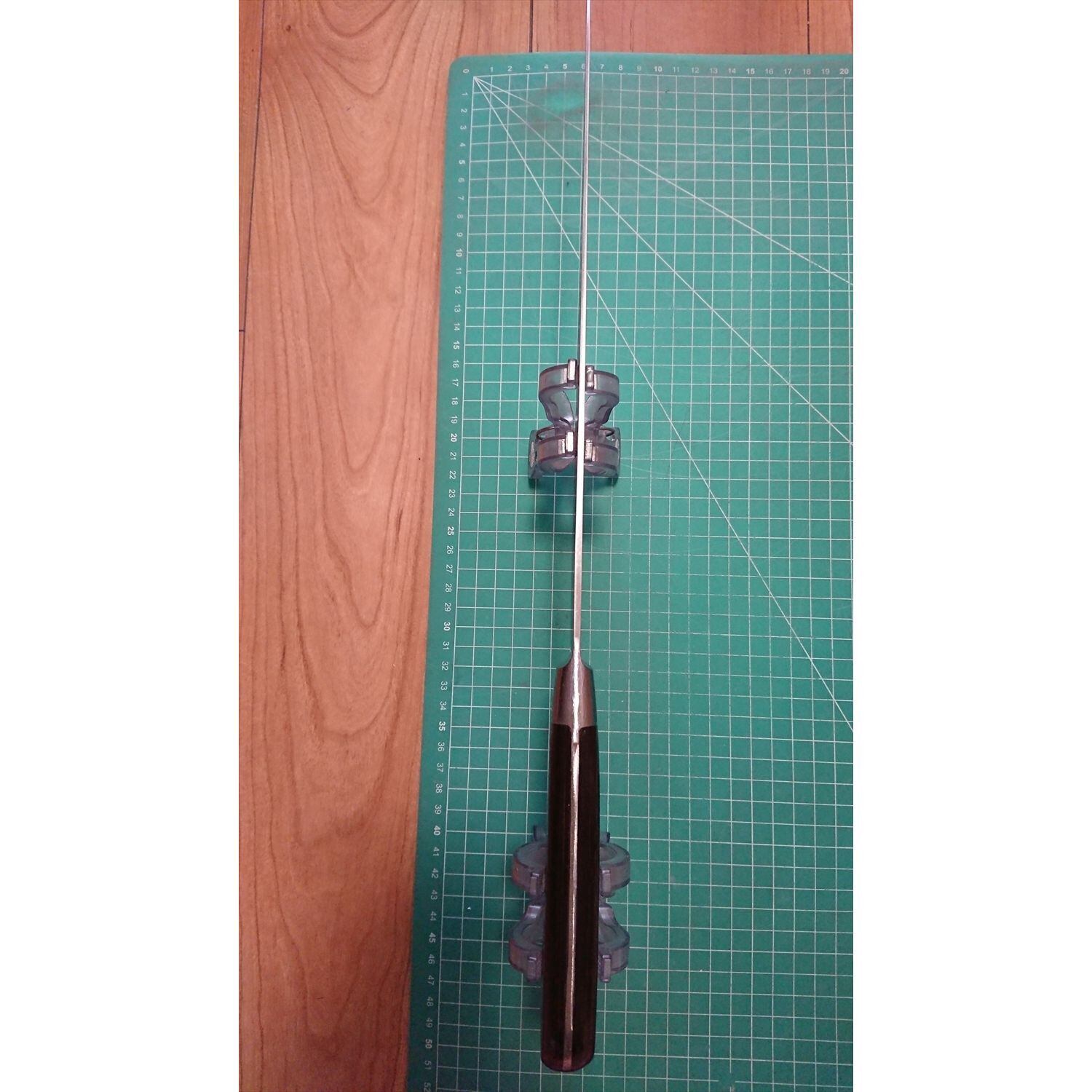 1. o3971/状態:中古/銘:東京杉本/筋引包丁(両刃 約 左1:右9 右利き用)/刃長:280/峰厚 アゴ上:2.6/重量:305/作り:鋼/他:柄は割れあるがオーバーホール済み。ツバの根元から柄全体にかけて樹脂コーティング済み(3回塗り。防汚防サビの為)
