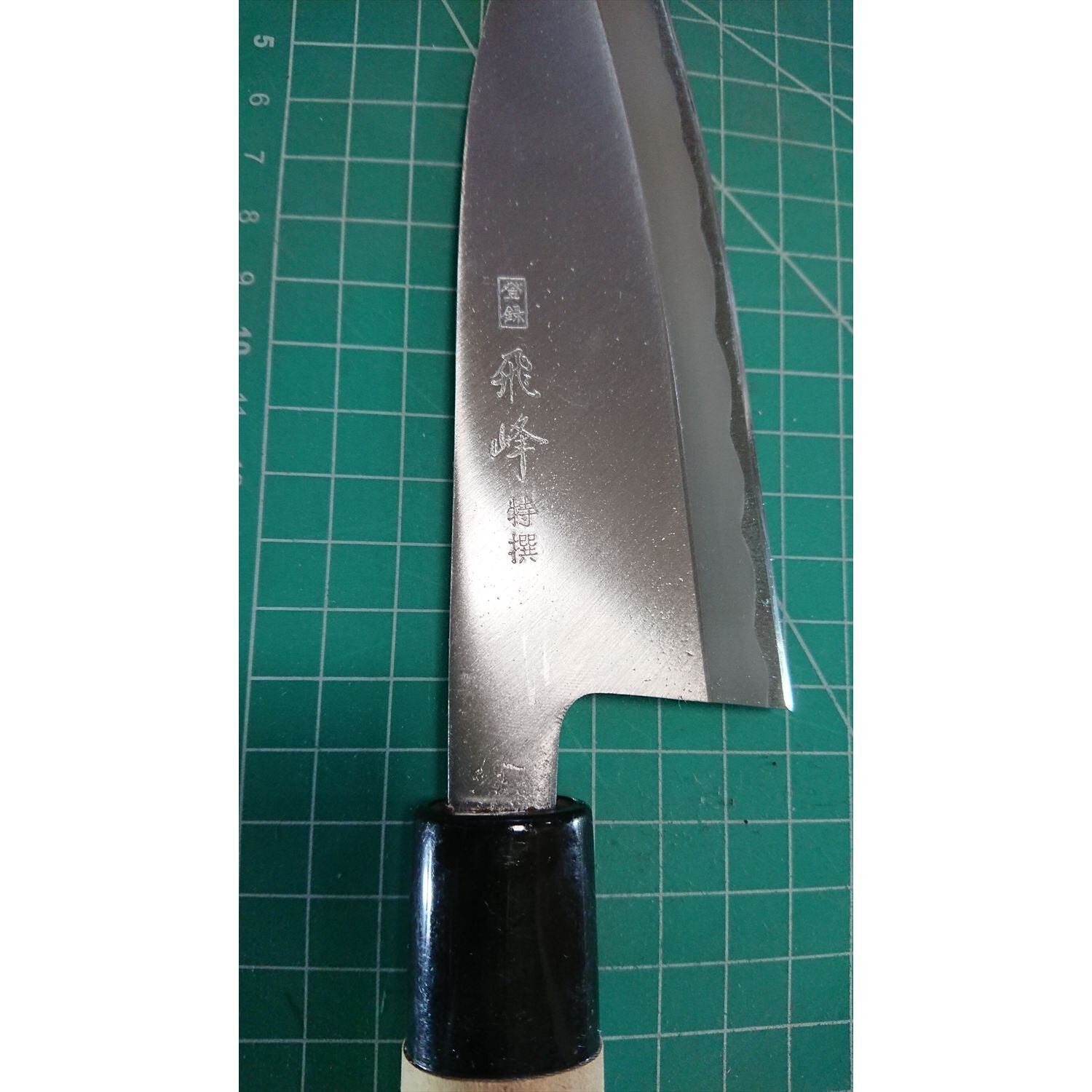 1. o3988/状態:中古/銘:飛峰/出刃包丁(片刃 右利き用)/刃長:150/峰厚 アゴ上:5.9/重量:245/作り:炭素鋼/他: