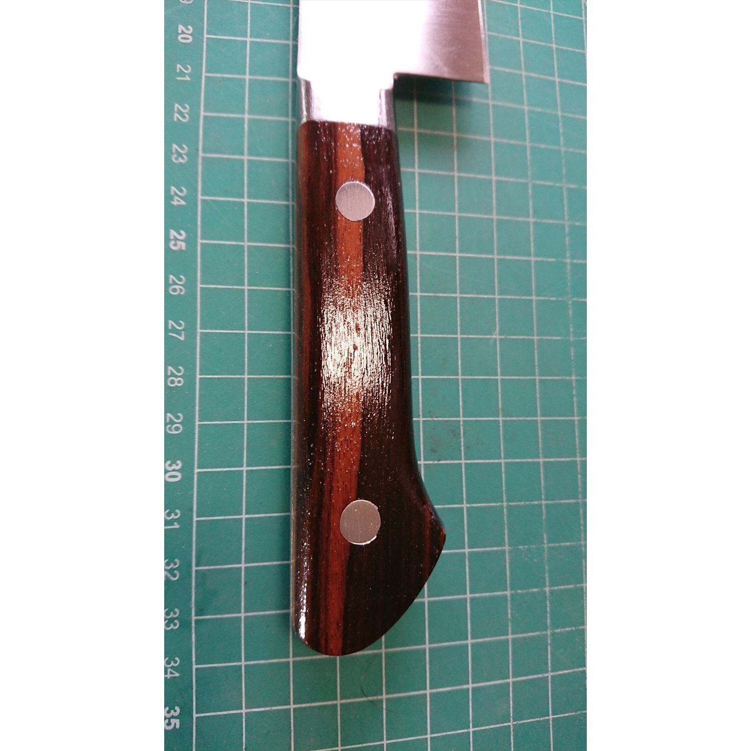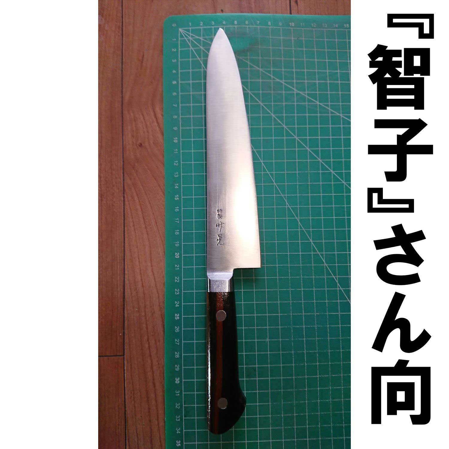1. o3908/状態:中古/銘:竹晃/牛刀(両刃 左5:右5 右利き・左利き兼用)/刃長:210/峰厚 アゴ上:2.3/重量:201/作り:鋼/他:ツバの根元から柄全体にかけて樹脂コーティング済み(3回塗り。防汚防サビの為)